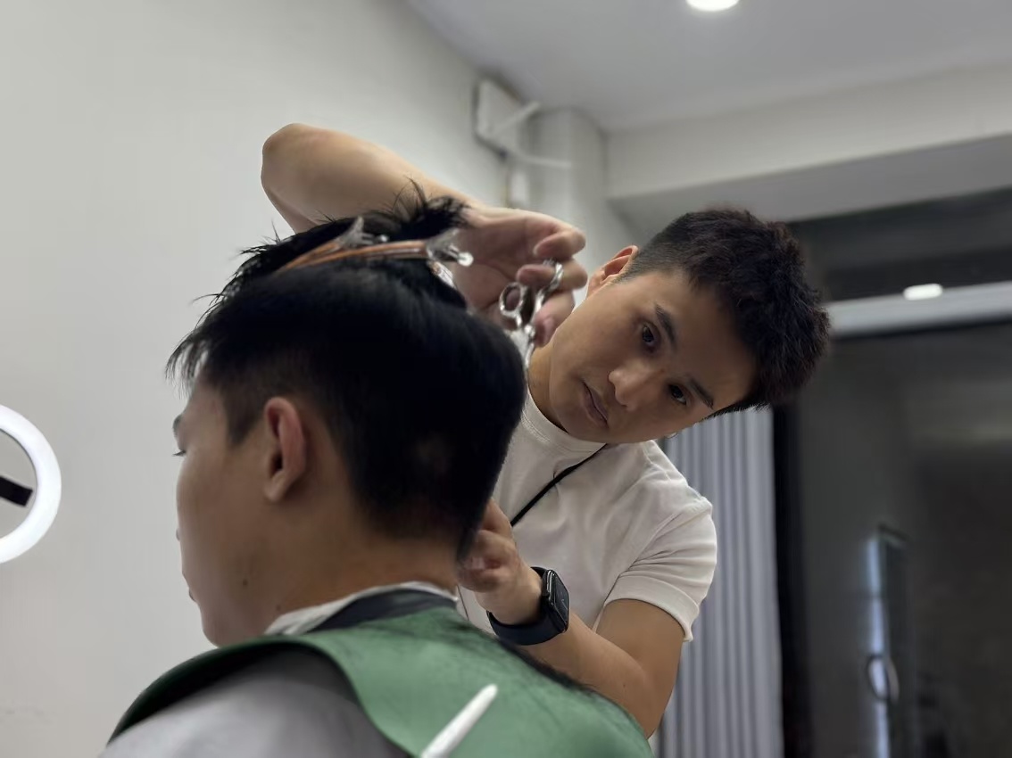 在他看來,最重要的是理解顧客的意思,尊重其需求。對于初次上門顧客,他每剪好一個部位,都拍照片給客人確認并調(diào)整。一個發(fā)型做下來,大概要拍4—5次照片。